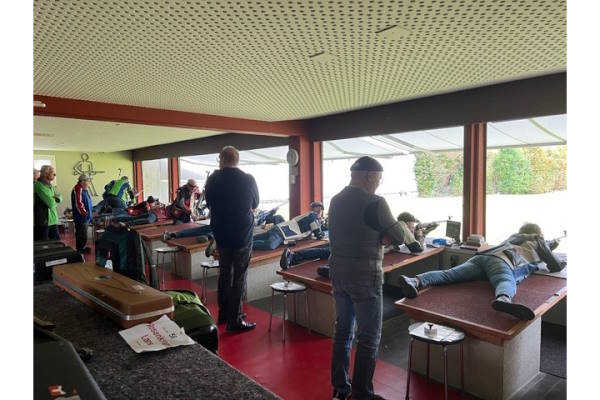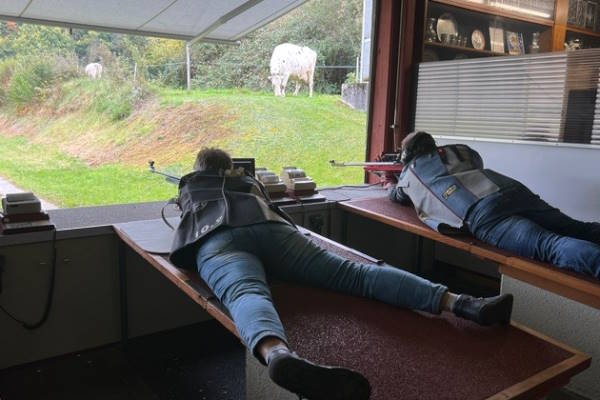 Der Schiessstand war gut besetzt und sogar draussen fand man sich in Gesellschaft. Kühe, die uns mit ihrem Muhen anfeuerten (Spass), gemuht wurde nicht, es herrschte eine konzentrierte Stimmung. Wie es beim Schiessen üblich, schaut man, dass mindestens ein Kamerad hinter uns blieb, damit er bei Problemen helfen kann. Deshalb schossen Jann und ich zuerst und Vreni schaute zu (auf ihre Weisung).
